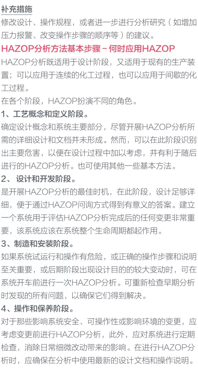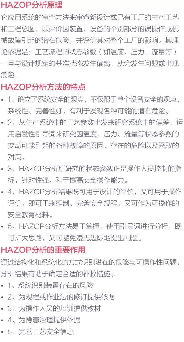 在我國,國家安監(jiān)局也非常重視HAZOP方法的應(yīng)用,并大力推廣,要求涉及“兩重點一重大”和首次工業(yè)化設(shè)計的涉及危險化學(xué)品的化工建設(shè)項目,必須在基礎(chǔ)設(shè)計階段開展HAZOP 分析(請參考安監(jiān)總局2013年76號令)。