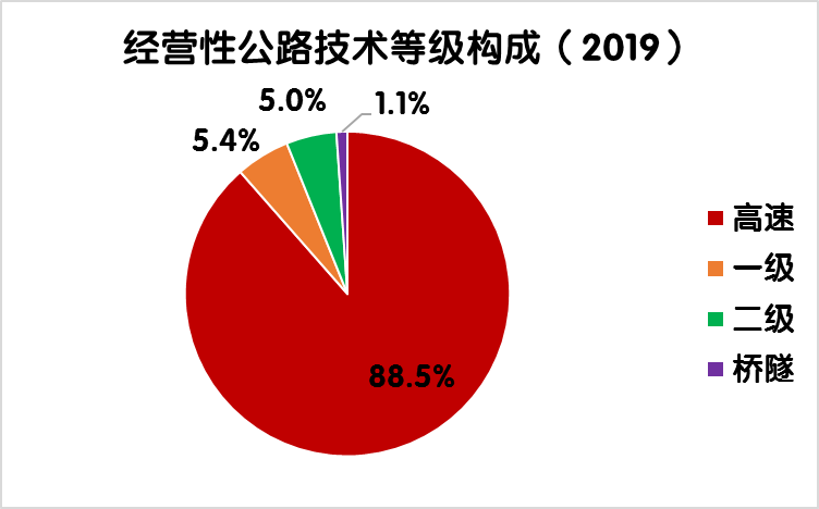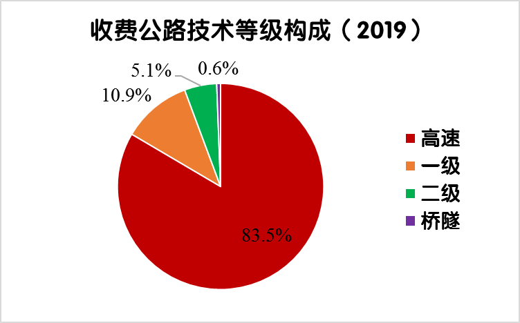 2019年末,全國(guó)收費(fèi)公路里程17.11萬公里,占公路總里程501.25萬公里的3.4%。其中,高速公路14.28萬公里,一級(jí)公路1.86萬公里,二級(jí)公路0.87萬公里,獨(dú)立橋梁及隧道1024公里,占比分別為83.5%、10.9%、5.1%和0.6%。