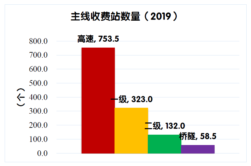 2019年末,全國(guó)收費(fèi)公路共有主線收費(fèi)站1267個(gè),比上年末凈減少49個(gè)。其中,高速公路753.5個(gè),一級(jí)公路323個(gè),二級(jí)公路132個(gè),獨(dú)立橋梁及隧道58.5個(gè),占比分別為59.5%、25.5%、10.4%和4.6%。