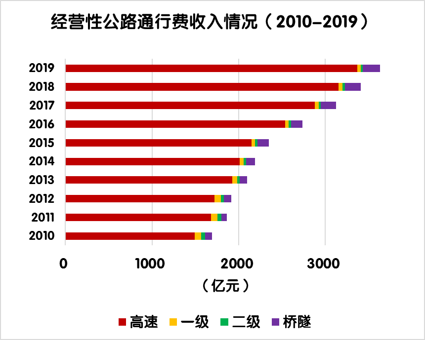 2019年度,全國(guó)收費(fèi)公路車輛通行費(fèi)總收入5937.9億元。其中,高速公路5551.0億元,一級(jí)公路114.1億元,二級(jí)公路41.2億元,獨(dú)立橋梁及隧道231.5億元,占比分別為93.5%、1.9%、0.7%和3.9%。