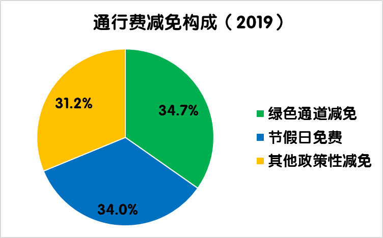 2019年度,全國(guó)收費(fèi)公路共減免車輛通行費(fèi)1009.7億元,占2019年度應(yīng)收通行費(fèi)總額的14.5%,比上年增加91.9億元,增長(zhǎng)10%。其中,鮮活農(nóng)產(chǎn)品運(yùn)輸“綠色通道”減免350.8億元,占全年通行費(fèi)減免總金額的比例為34.7%,比上年增加5.8億元,增長(zhǎng)1.7%;重大節(jié)假日免收小型客車通行費(fèi)343.7億元,占全年通行費(fèi)減免總金額的比例為34.0%,比上年增加35.7億元,增長(zhǎng)11.6%;高速公路差異化收費(fèi)、ETC通行費(fèi)優(yōu)惠、搶險(xiǎn)救災(zāi)車輛免費(fèi)等其他政策性減免315.3億元,占全年通行費(fèi)減免總金額的比例為31.2%。比上年增加50.4億元,增長(zhǎng)19%。