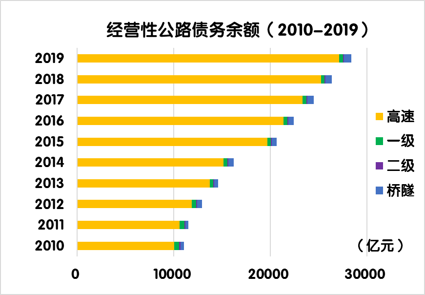 2019年末,經(jīng)營(yíng)性公路債務(wù)余額28387.6億元,占收費(fèi)公路債務(wù)余額的46.1%。其中,經(jīng)營(yíng)性高速公路債務(wù)余額27154.9億元,一級(jí)公路403.1億元,二級(jí)公路63.5億元,獨(dú)立橋梁及隧道766.1億元,占比分別為95.7%、1.4%、0.2%和2.7%。