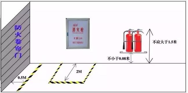 防火卷簾門兩側(cè)各0.5m范圍內(nèi)不得堆放物品,并應(yīng)用黃色標(biāo)識(shí)線劃定范圍。《人員密集場(chǎng)所消防安全管理》(GA654-2006)8.3.7